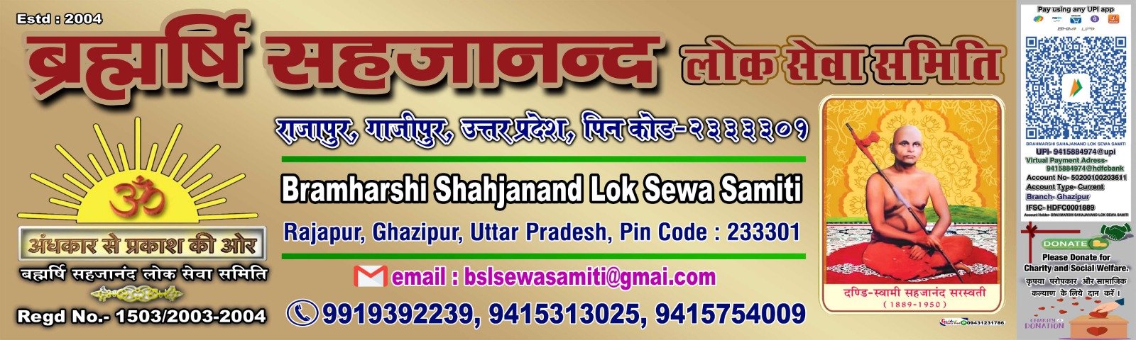 Brahmarshi Sahajanand Lok Seva Samiti is a voluntary organization, inspired by the thoughts of Swami Ji, which is an effort to provide opportunities for mental, emotional, moral and spiritual development of poor, labourers and unemployed youth and children for social, economic, spiritual, environmental and overall human development, along with this, education, literature, art, culture and tradition are also to be promoted so that the unity and integrity of the nation is maintained and human thinking and excellence can emerge. It is dedicated to this true service of single-minded devotion.